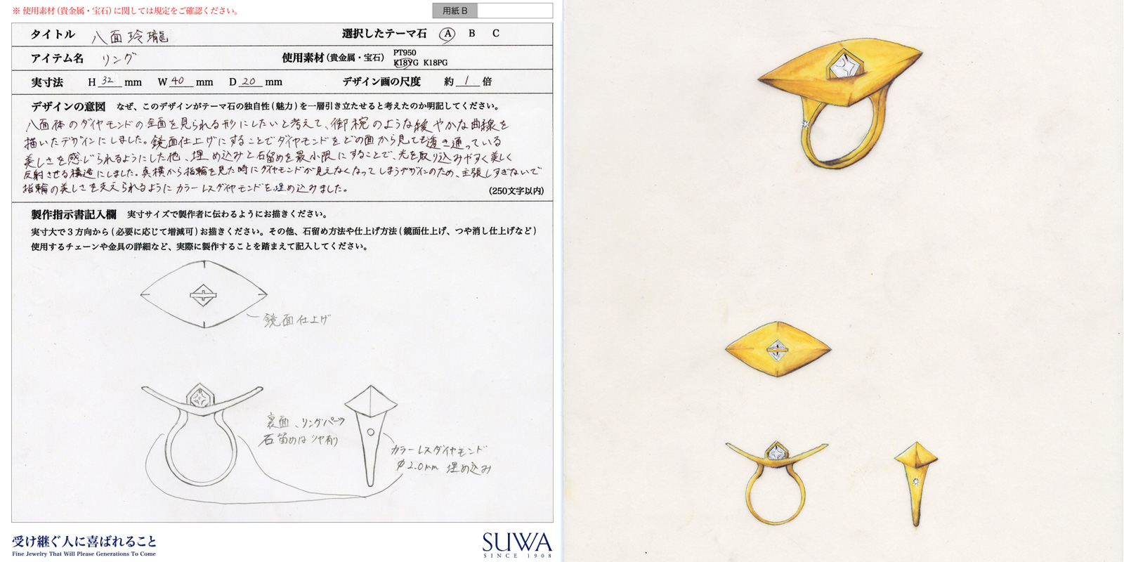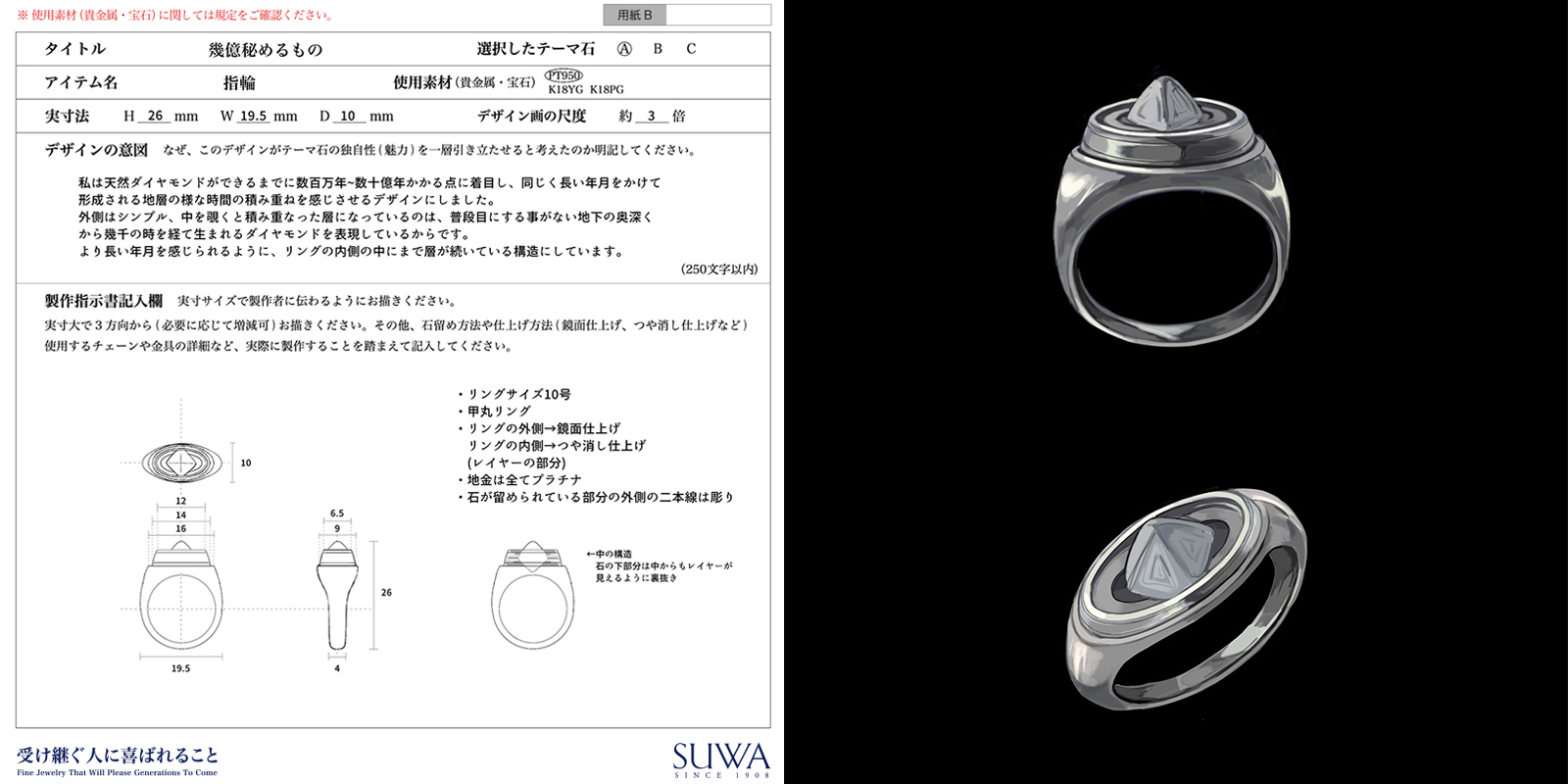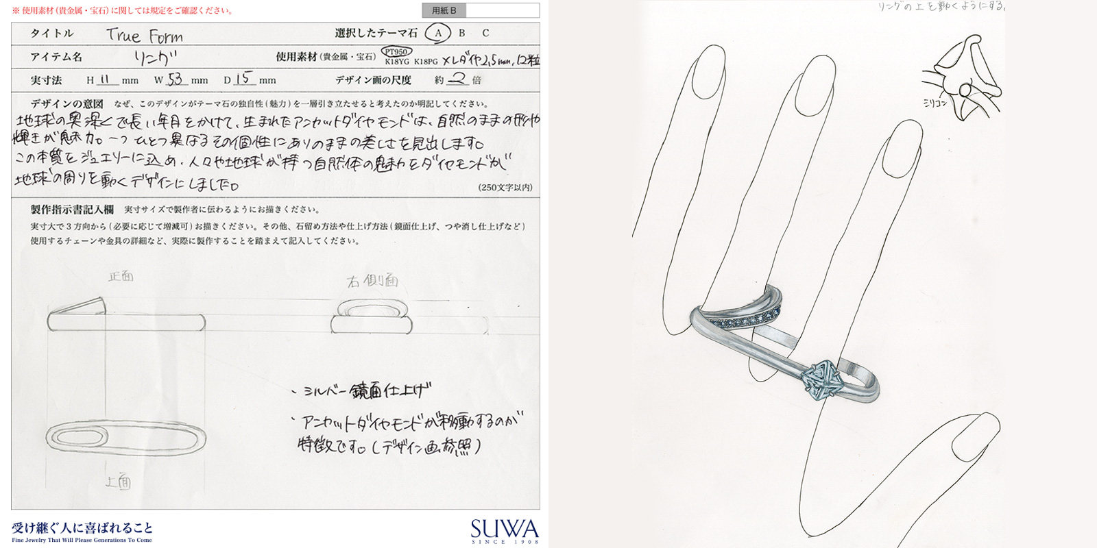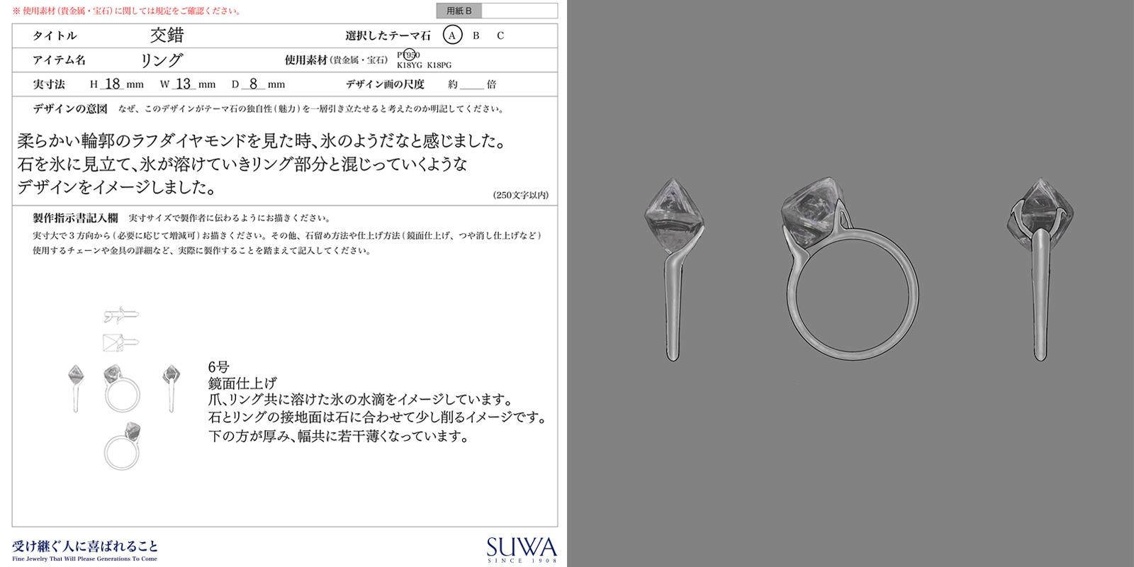 審査基準・独自性 アンカットダイヤモンド (人の手を加えていない、自然のままで美しいダイヤモンド) の魅力をより一層引き立てているか。