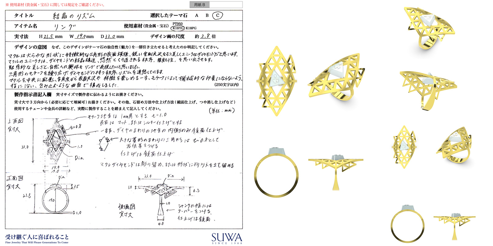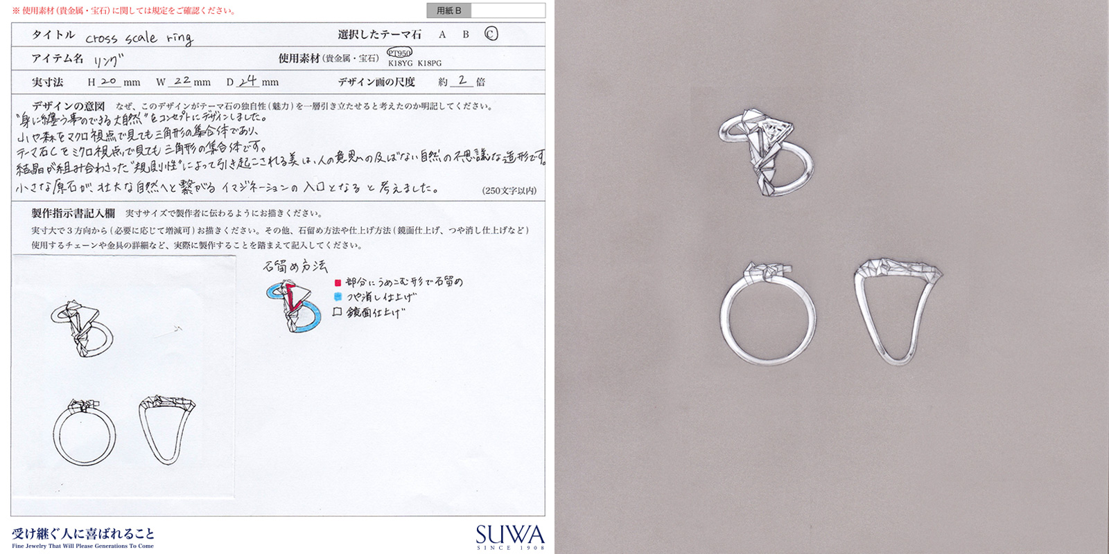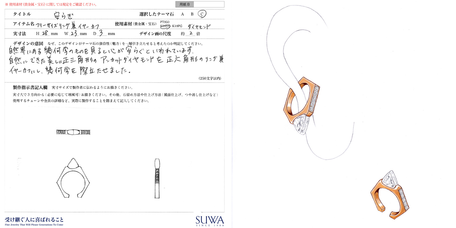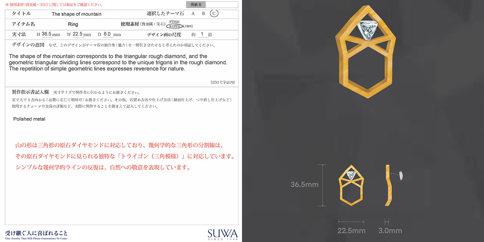 審査基準・独自性 アンカットダイヤモンド (人の手を加えていない、自然のままで美しいダイヤモンド) の魅力をより一層引き立てているか。