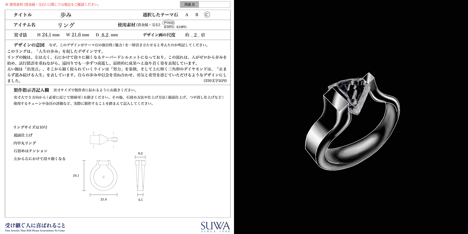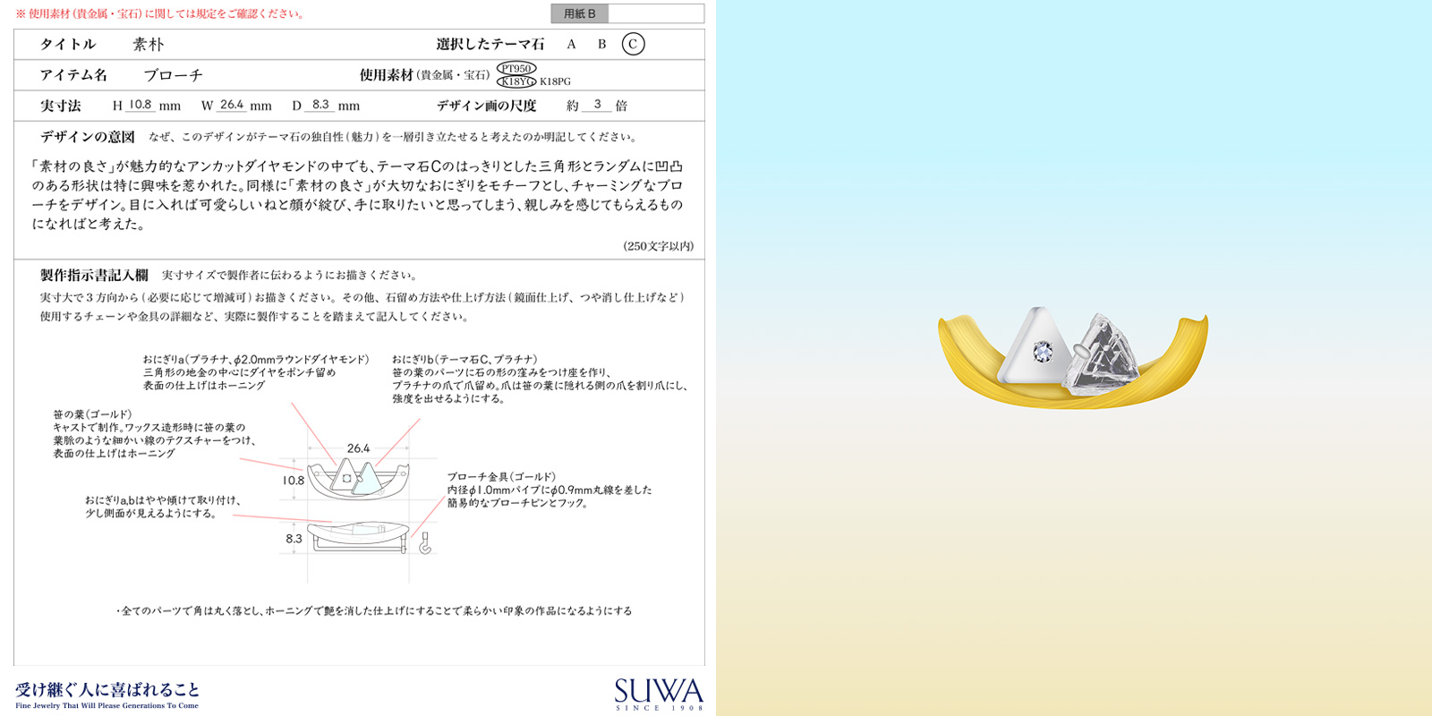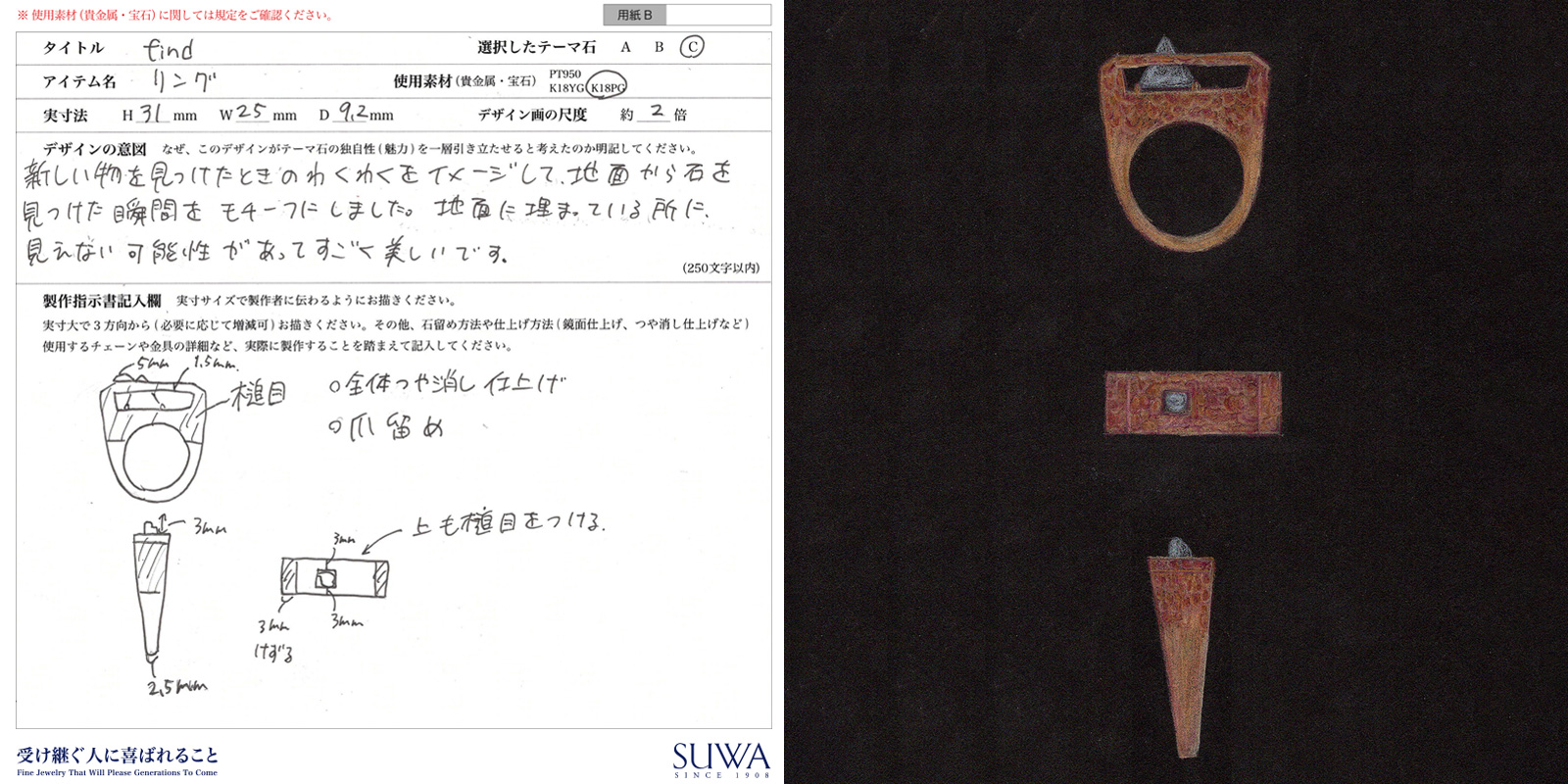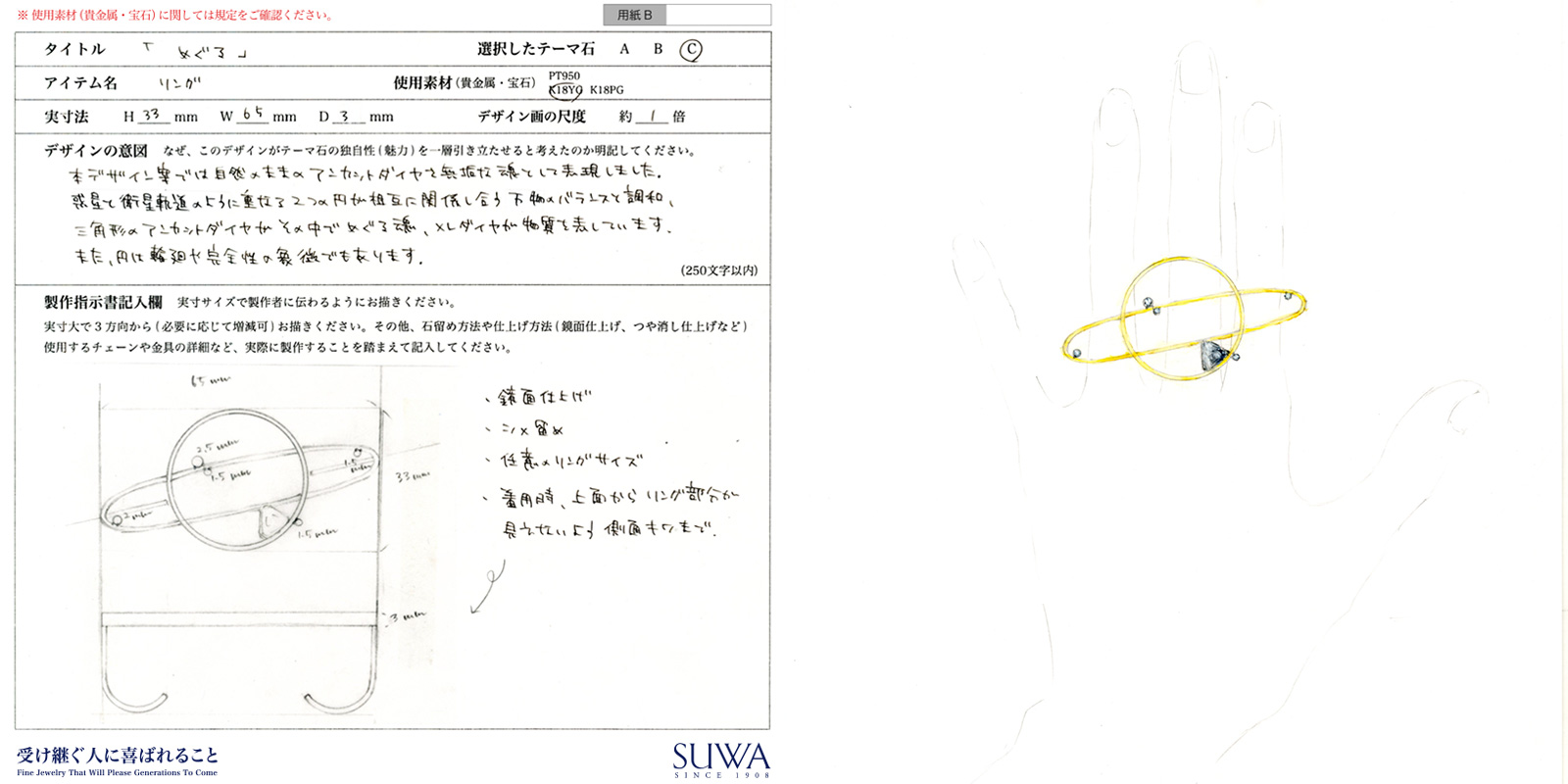 審査基準・独自性 アンカットダイヤモンド (人の手を加えていない、自然のままで美しいダイヤモンド) の魅力をより一層引き立てているか。
