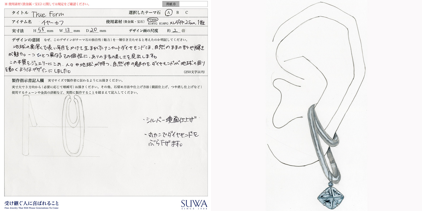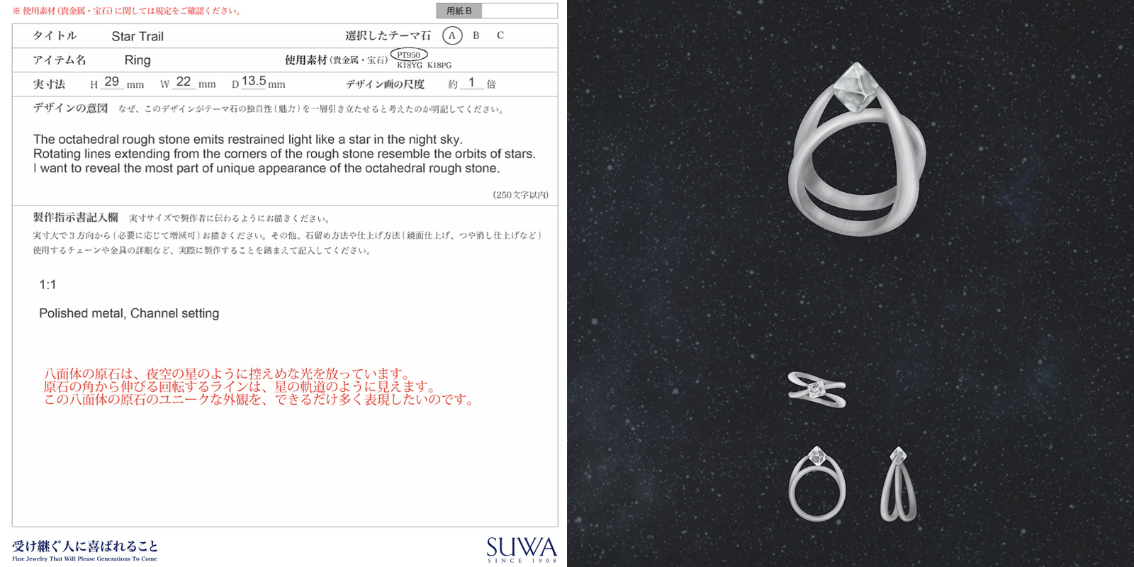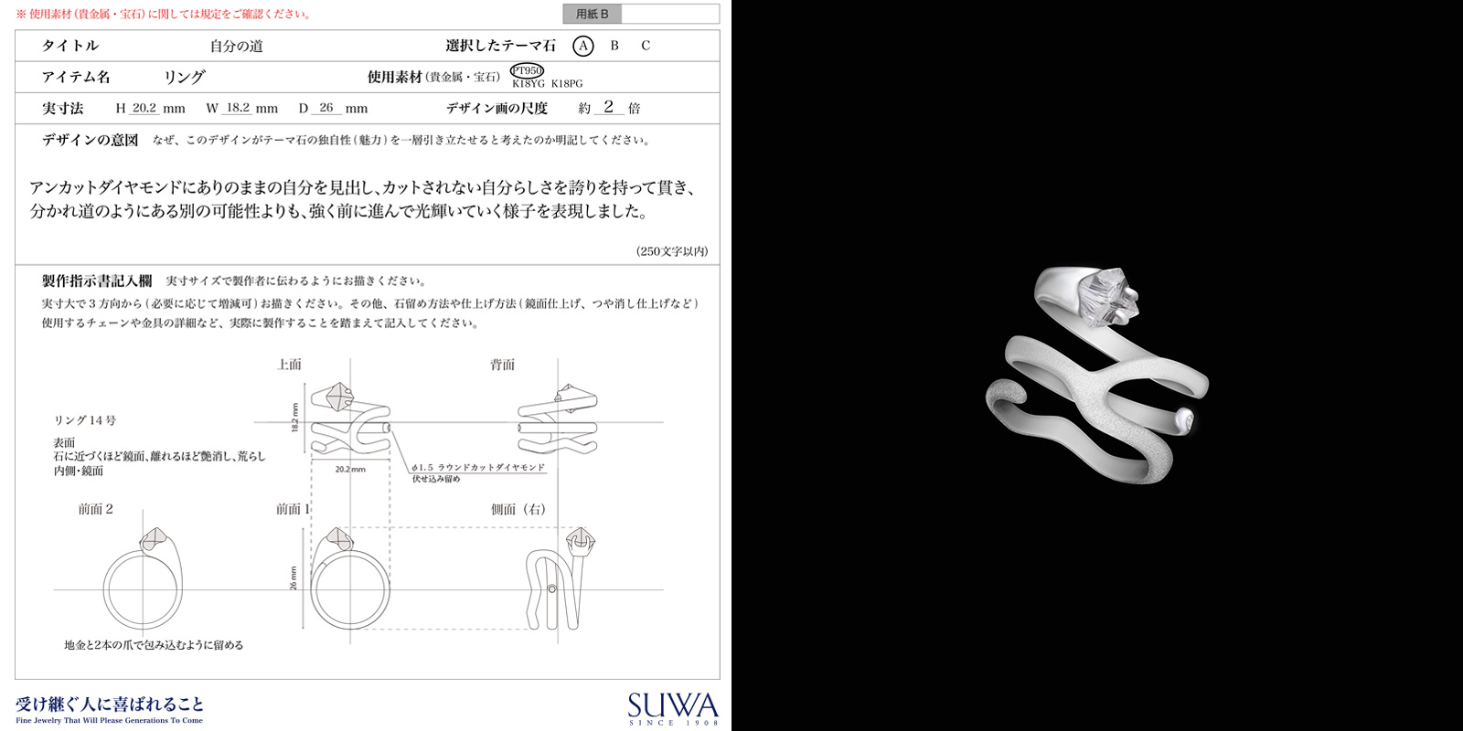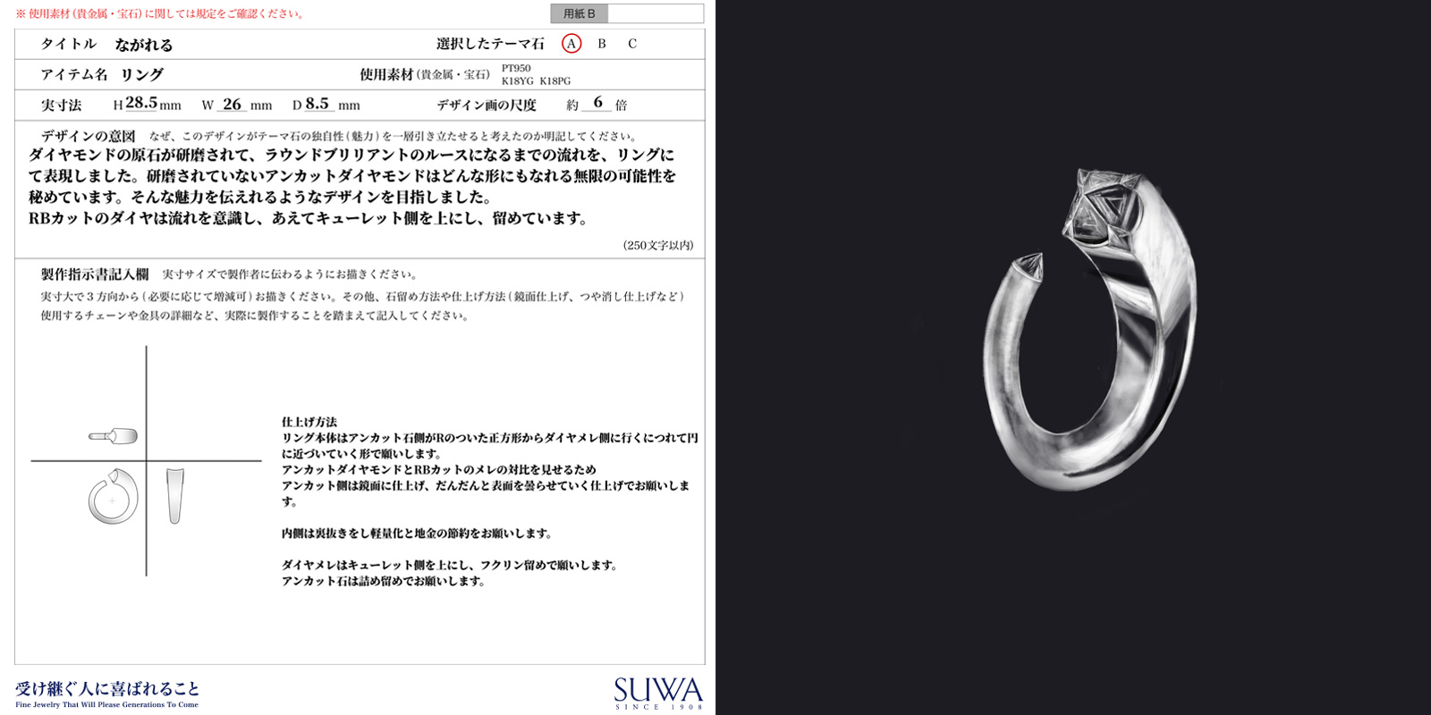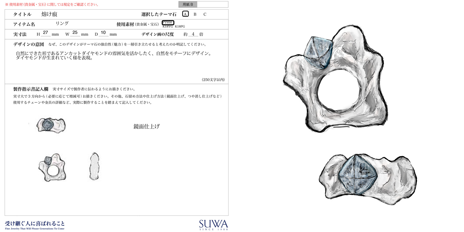 審査基準・独自性 アンカットダイヤモンド (人の手を加えていない、自然のままで美しいダイヤモンド) の魅力をより一層引き立てているか。