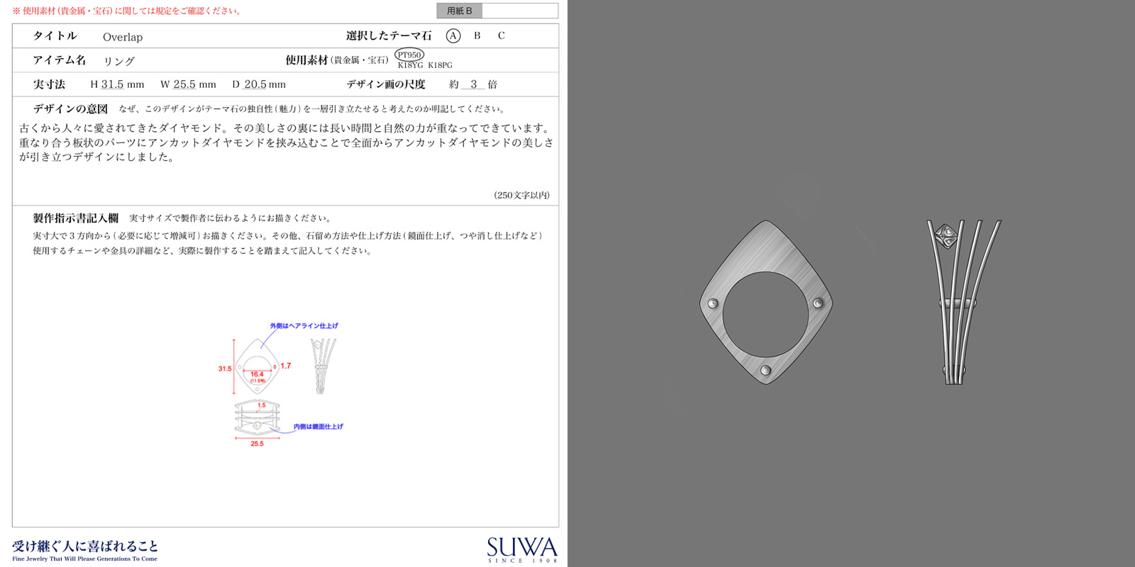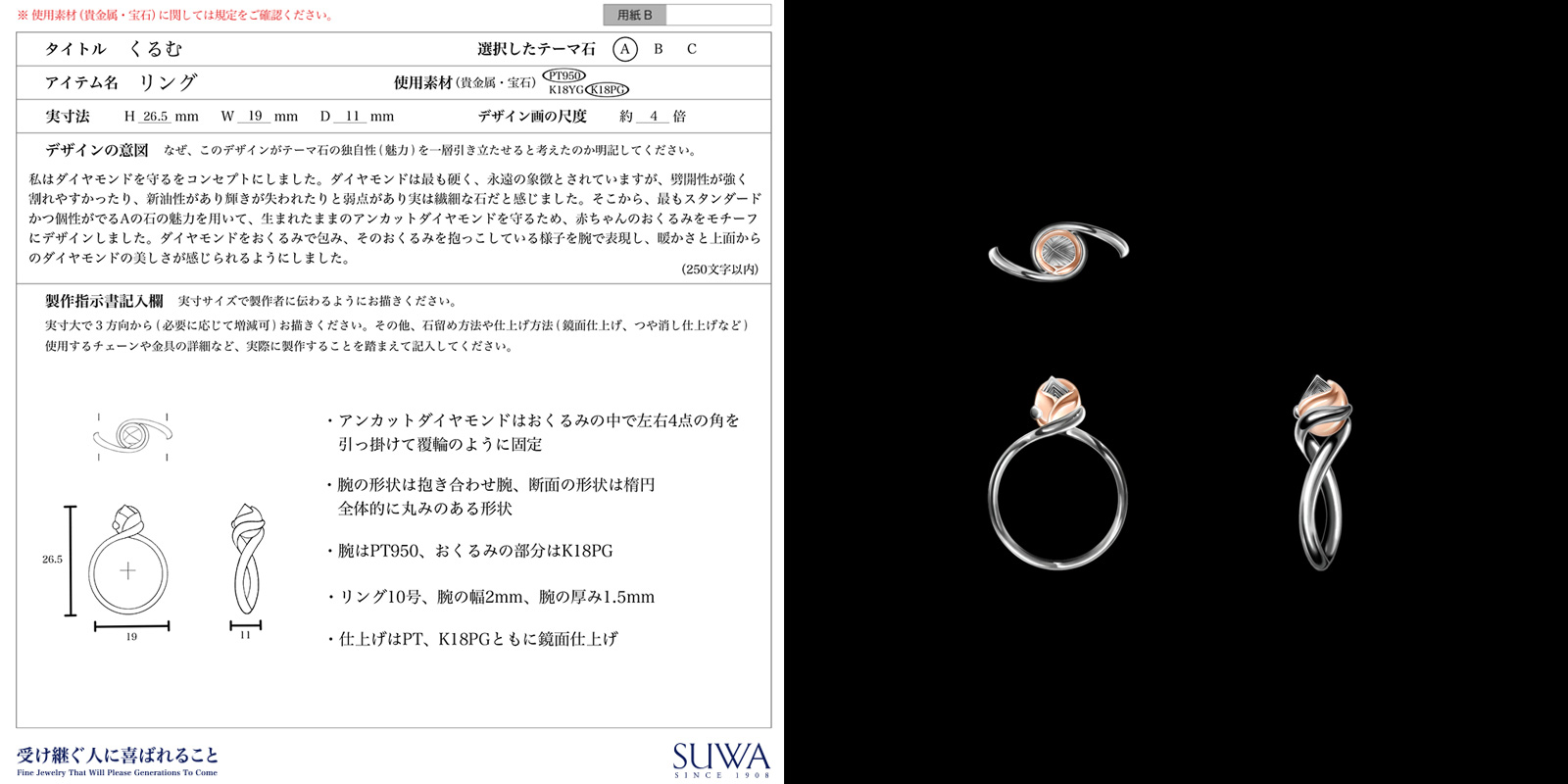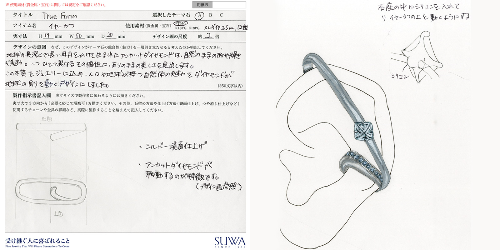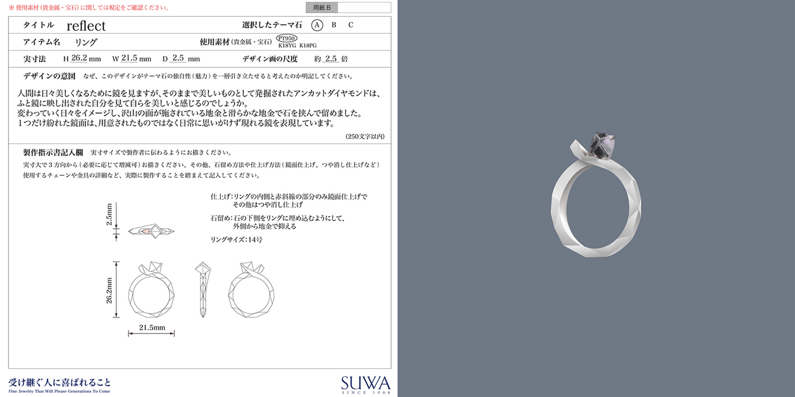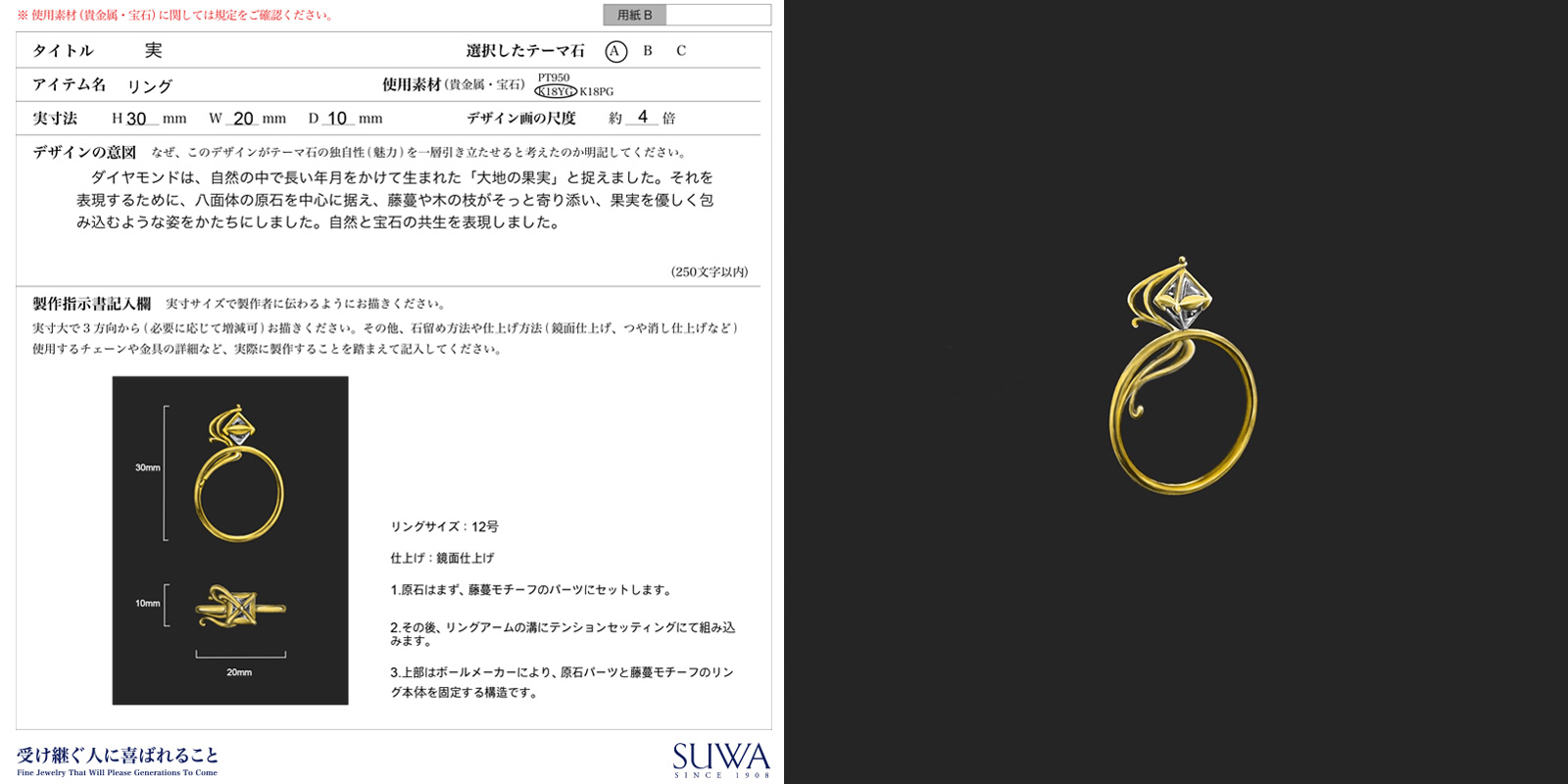 審査基準・独自性 アンカットダイヤモンド (人の手を加えていない、自然のままで美しいダイヤモンド) の魅力をより一層引き立てているか。