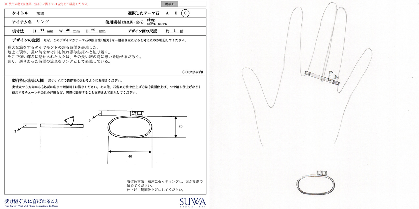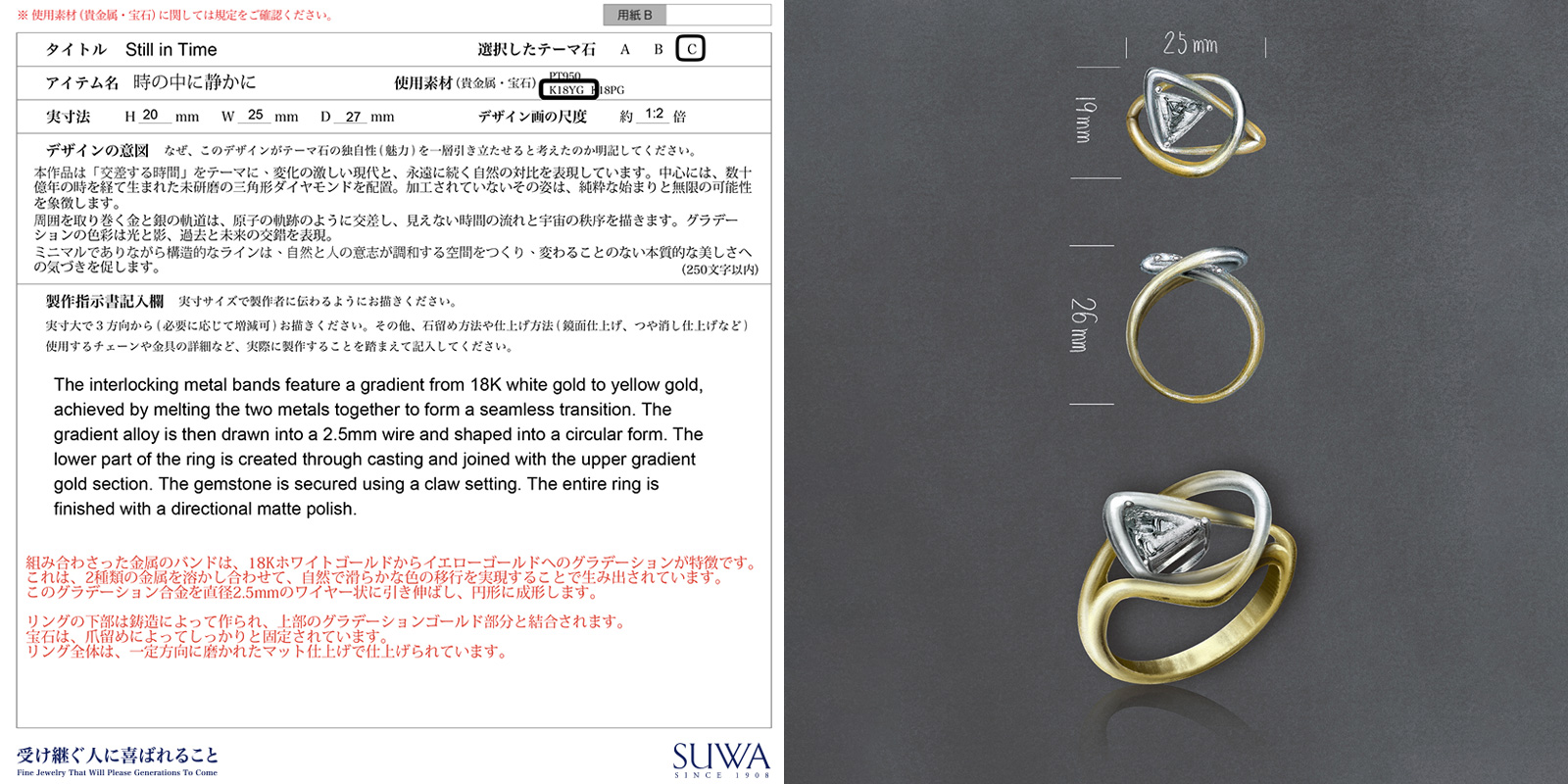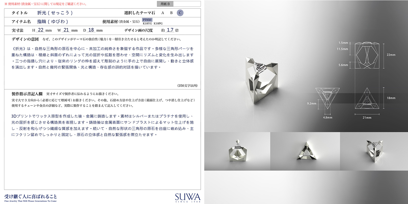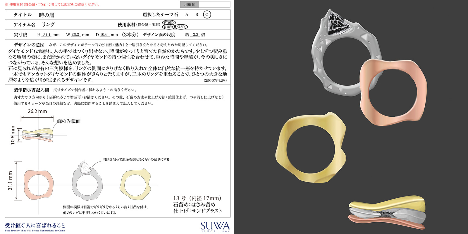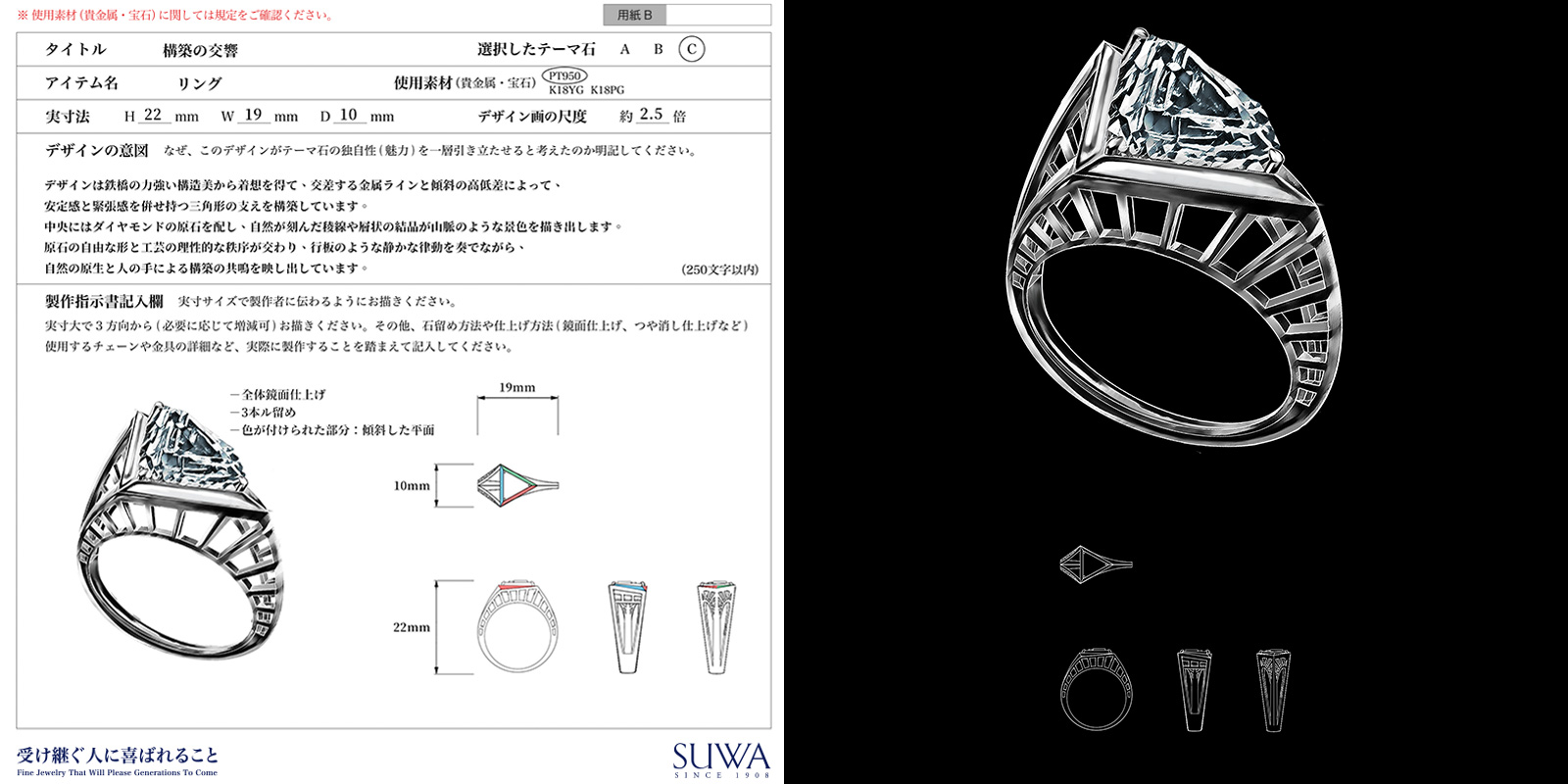 審査基準・独自性 アンカットダイヤモンド (人の手を加えていない、自然のままで美しいダイヤモンド) の魅力をより一層引き立てているか。