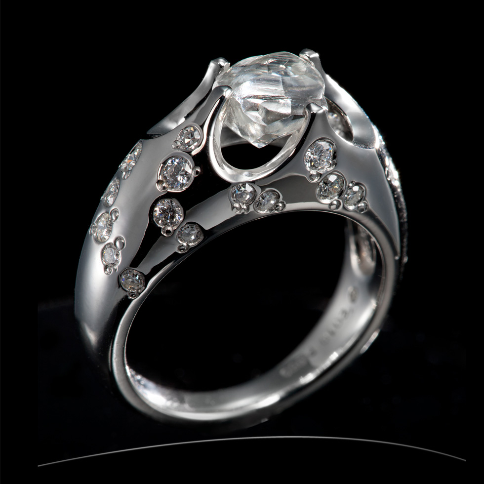 中央のダイヤモンドは、研磨など人の手を全く施していない、自然のままで艶がある美しいものです。唯一無二、あなただけのダイヤモンドの魅力をお楽しみください。