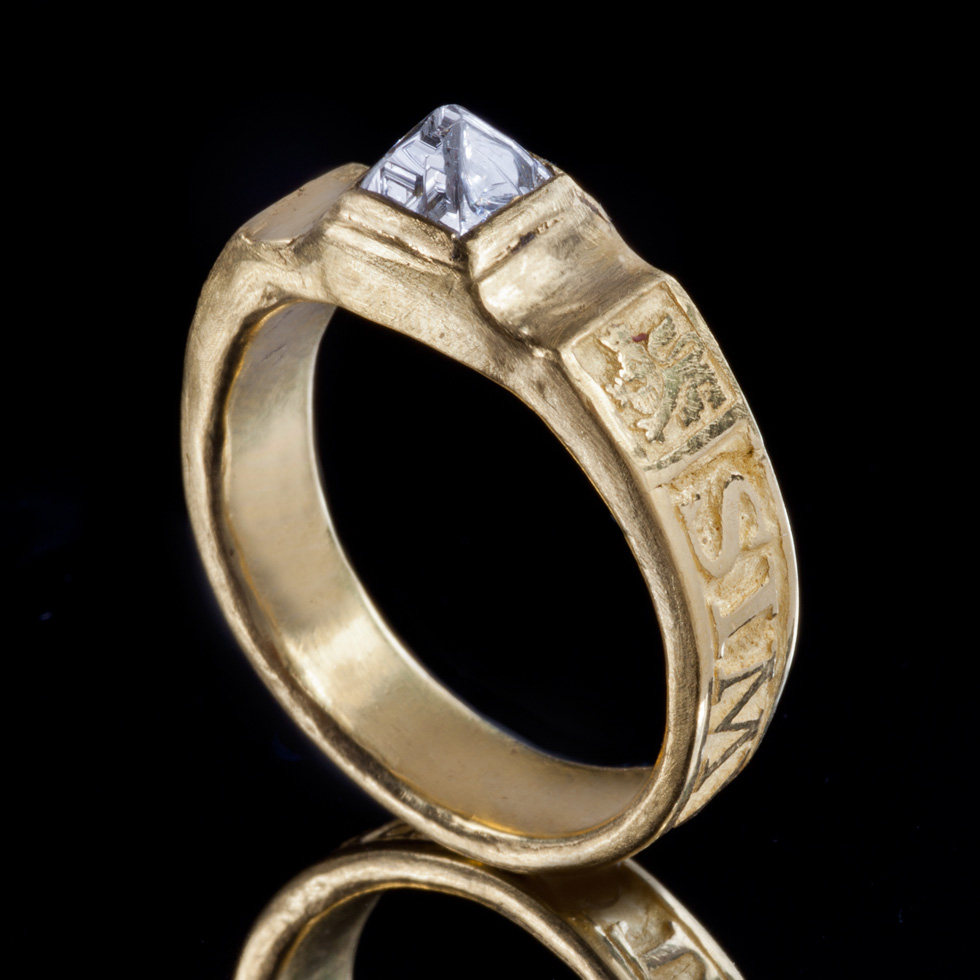 15世紀のルネサンス期に見られたスタイルを継承したリングです。腕の部分に想いを込めた言葉が刻まれたポージーリングです。ダイヤモンドは均整の取れた正八面体で、透明度が高く、良質なものです。22金を使って、当時の風合いを再現しています。自然のままのダイヤモンドの神秘性と込めた想いを毎日感じることのできるリングです。